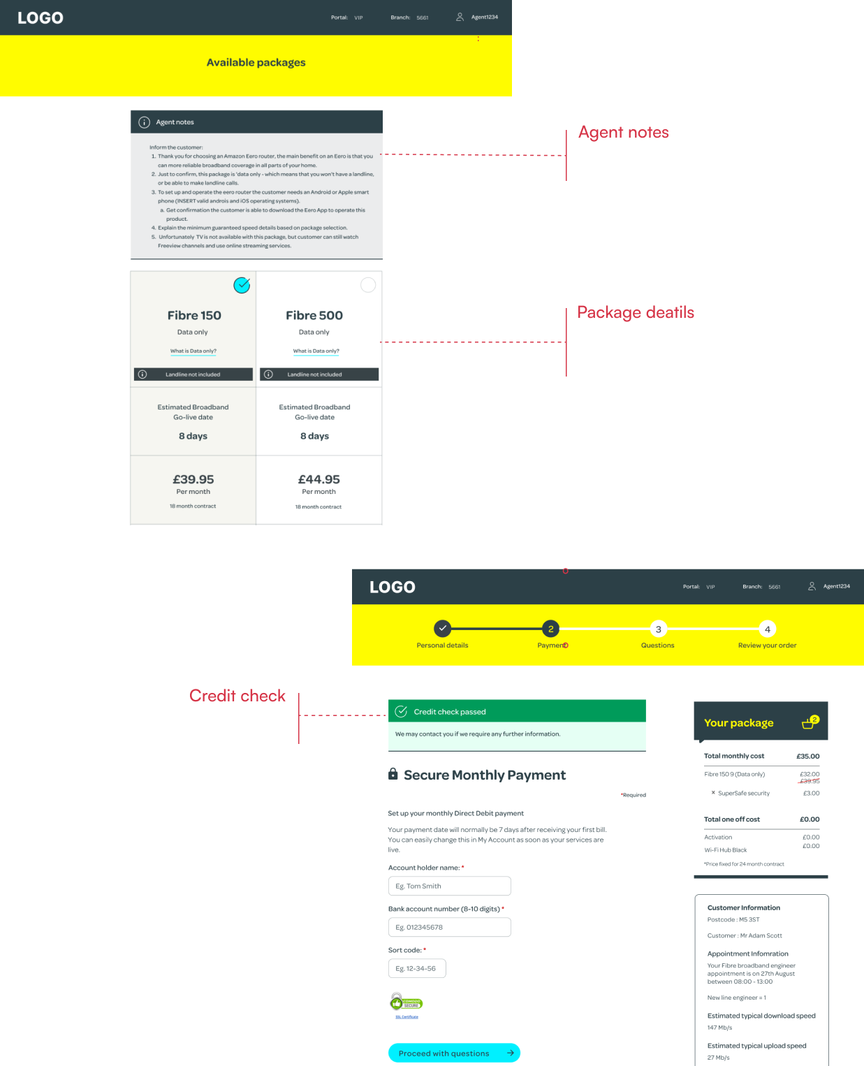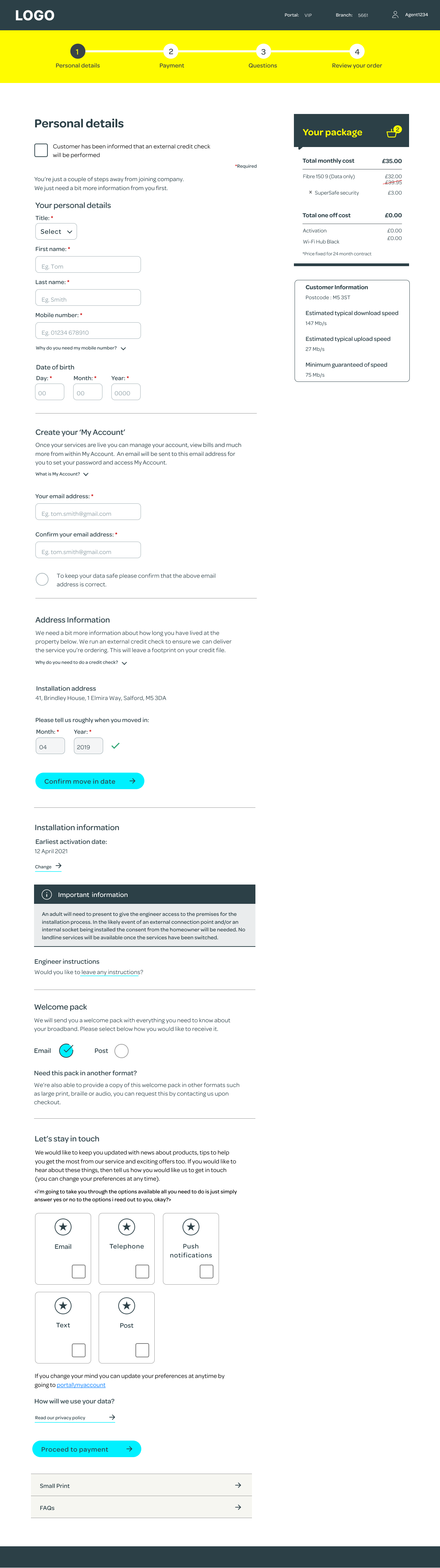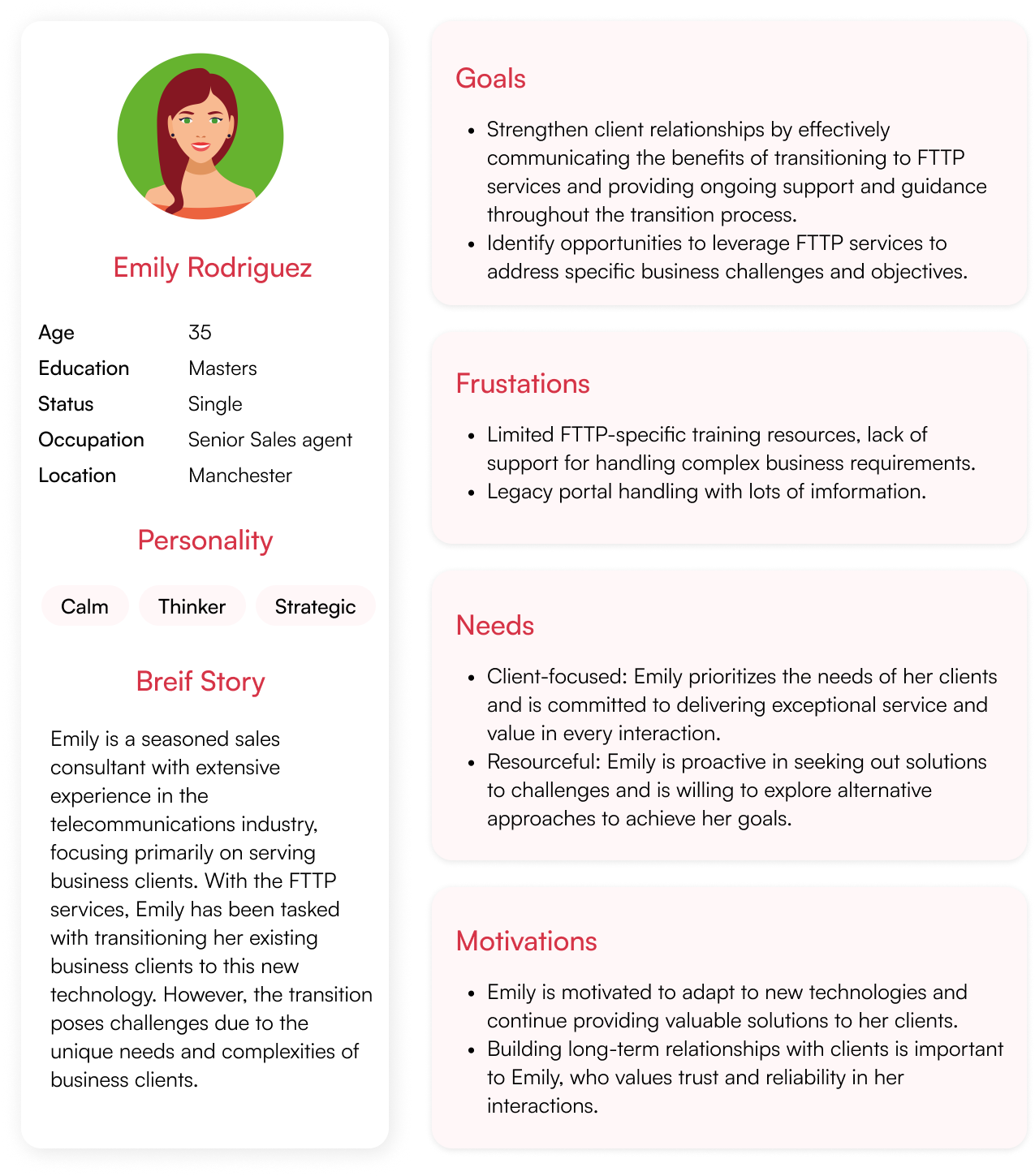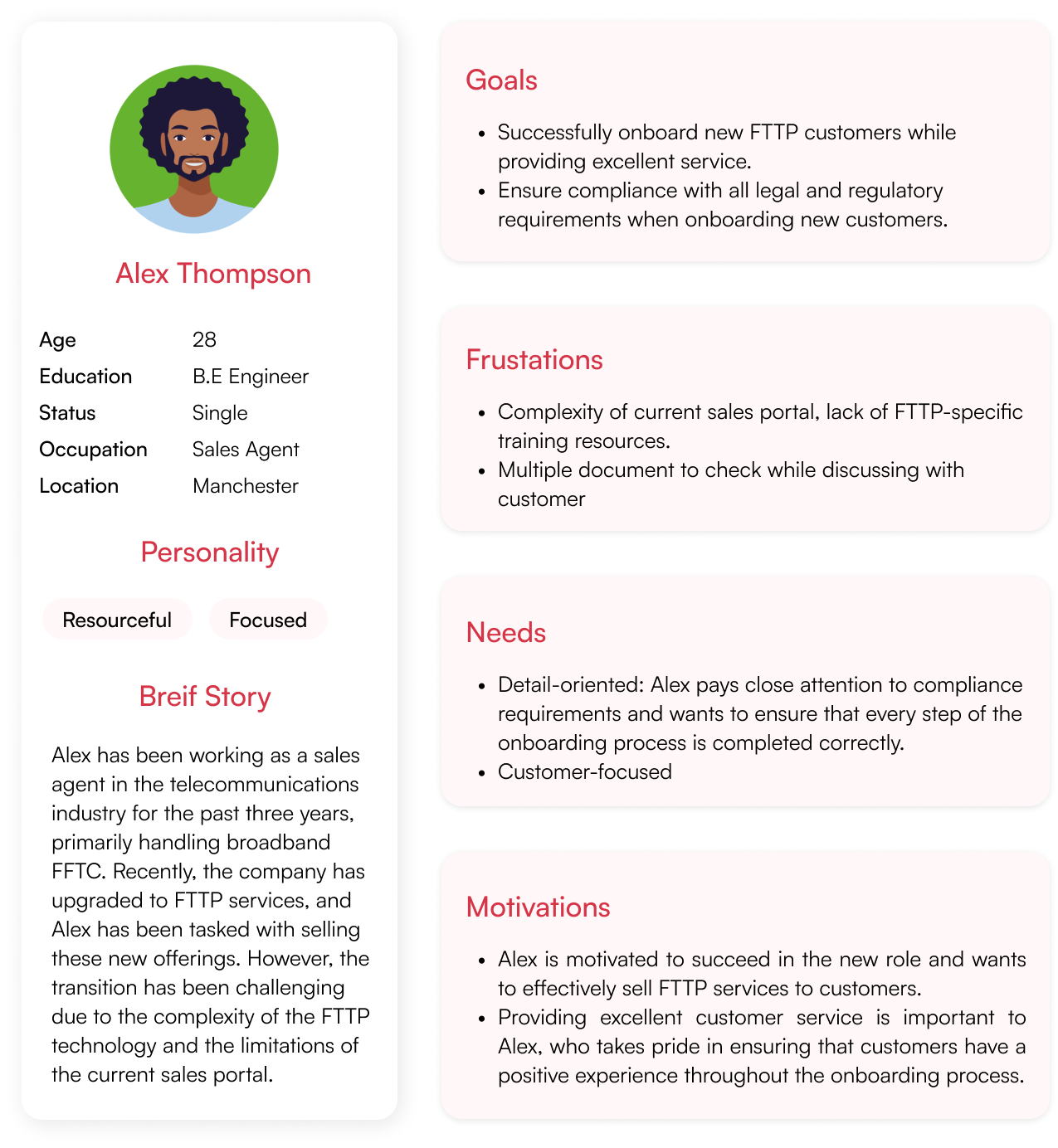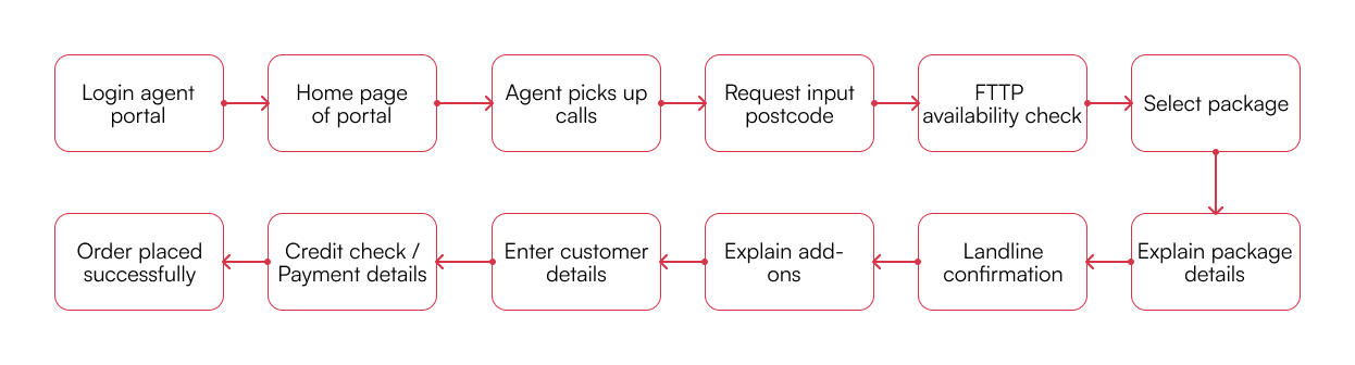 Through empathy mapping and research-driven insights, we have developed an intuitive, accessible, and efficient FTTP sales portal that addresses the key needs and frustrations of our sales agents. The new portal features simplified navigation, integrated compliance tools, and a streamlined credit check process. Comprehensive training resources and visual aids are readily available to support agents in their roles. Real-time feedback mechanisms enable continuous improvement. This user-centric design has significantly enhanced agent satisfaction and improved the overall customer onboarding experience, aligning with our goals of efficiency and compliance.