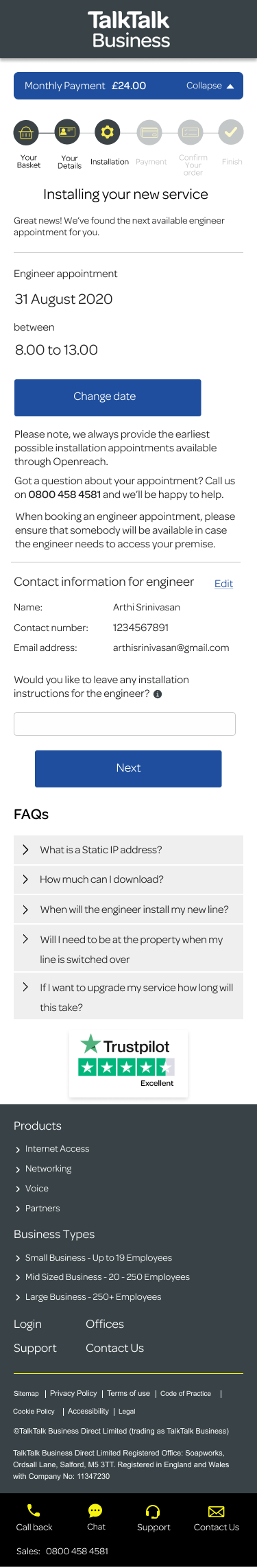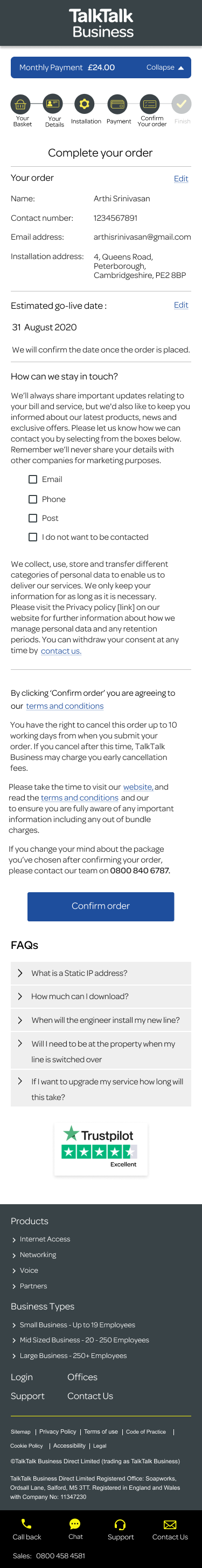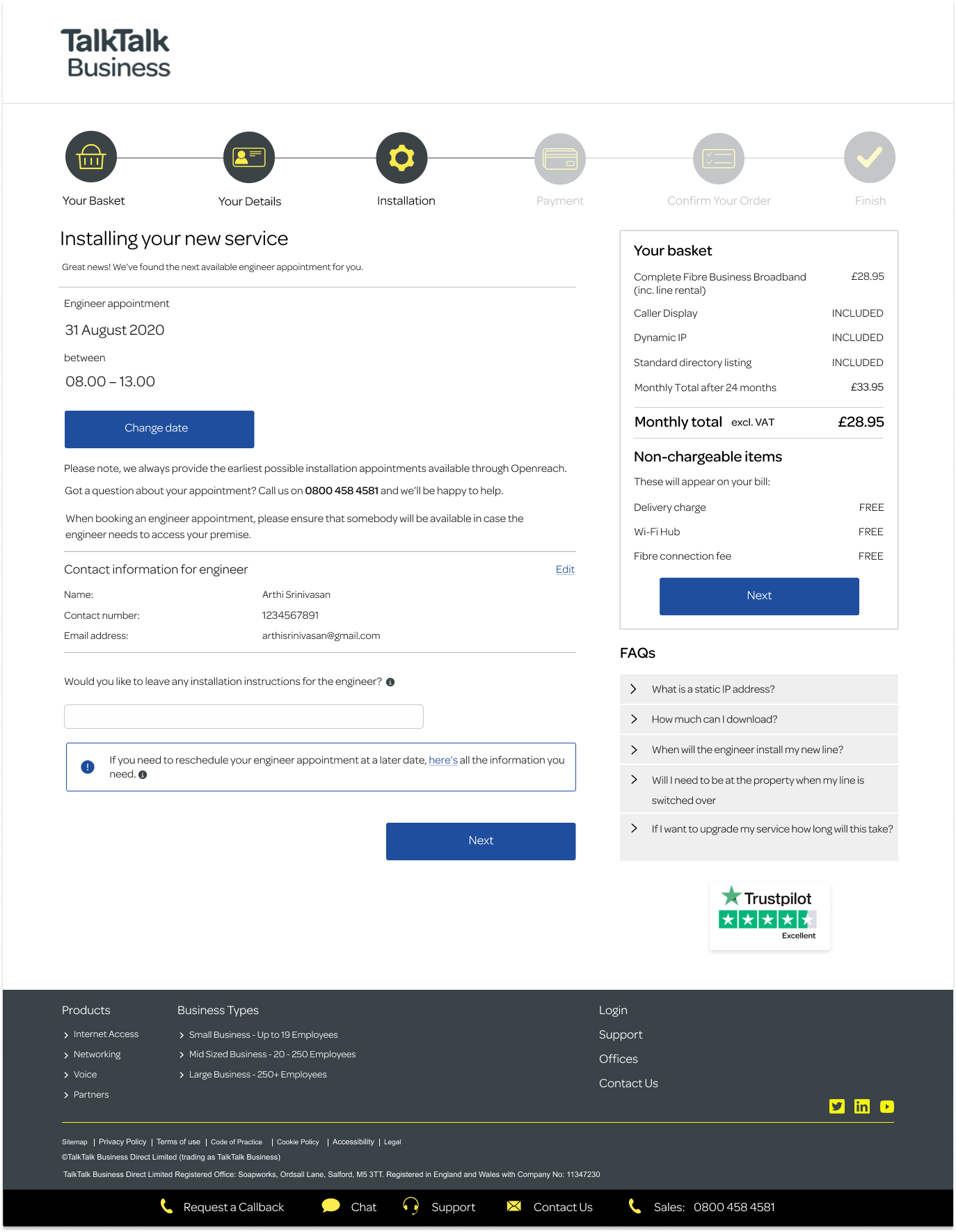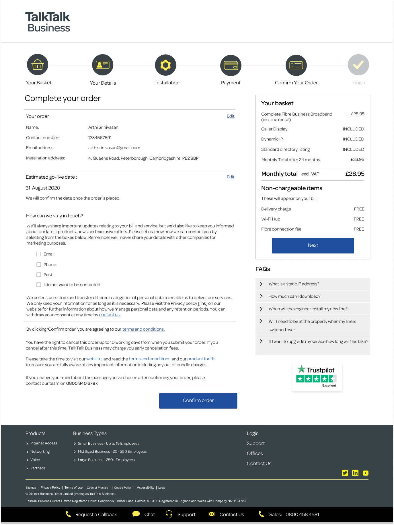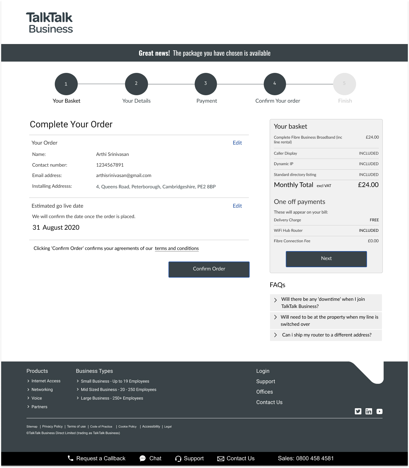 Four user tests were conducted with 32 participants recruited through User Testing. The goal of the testing was to identify usability issues on the FTTP checkout flow. The first couple of tests were thirty-minute, moderated sessions. Participants were given a scenario requiring them to buy a fibre broadband package on the TalkTalk website up until the payment page. The second two tests followed a similar structure but were unmoderated. In both cases, participants were given dummy data to use for form filling.