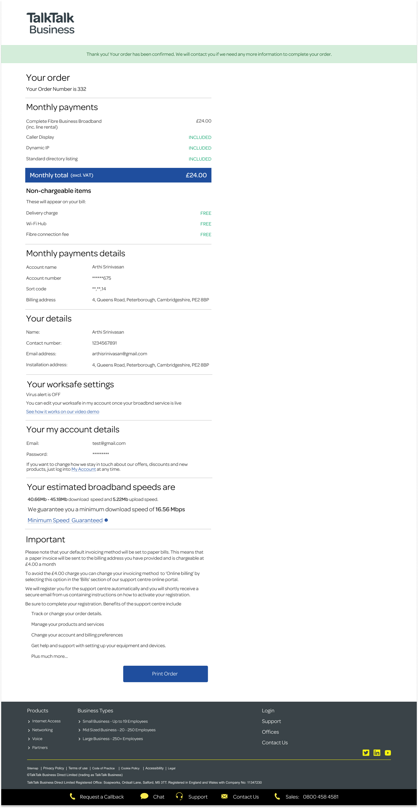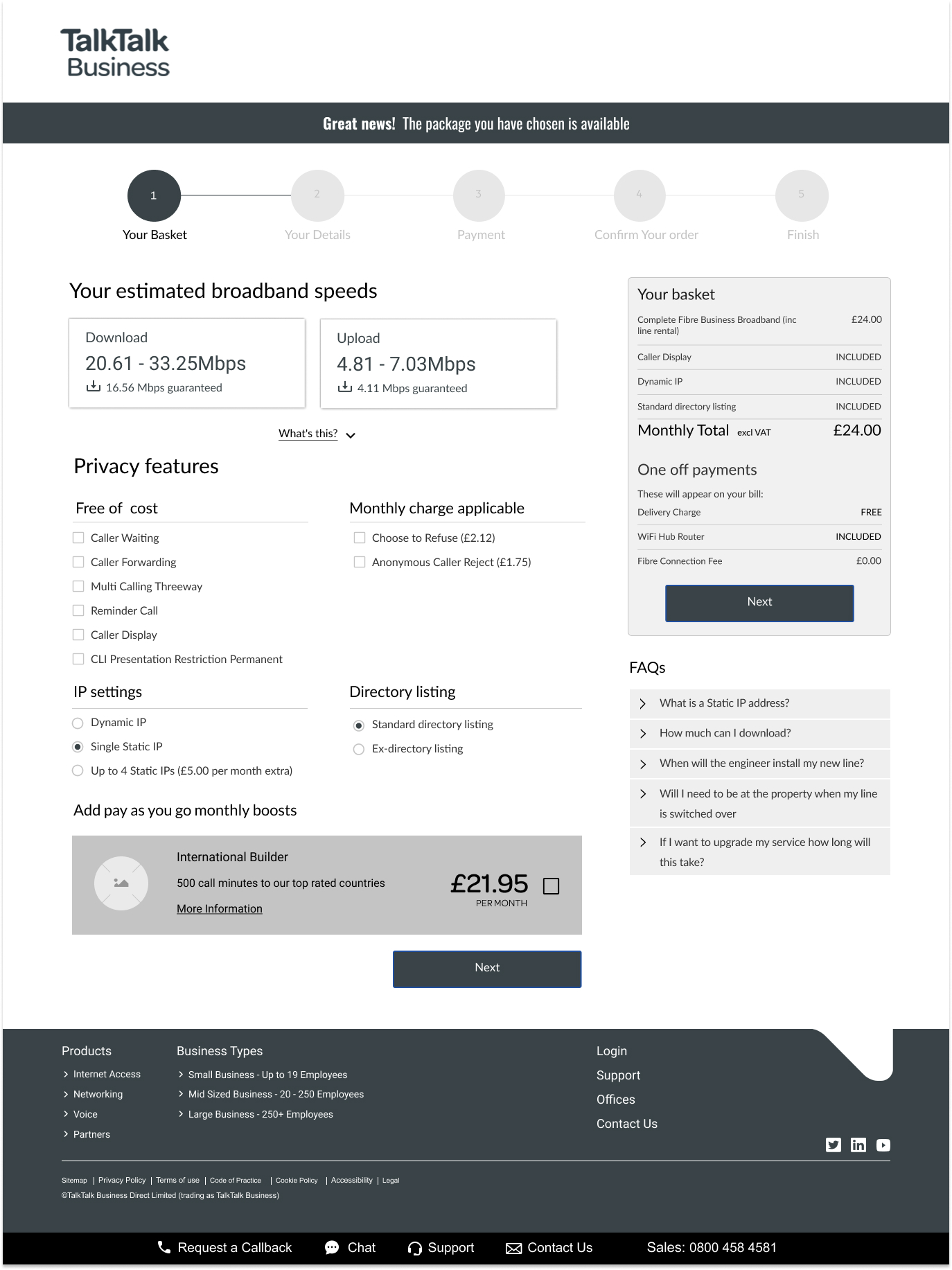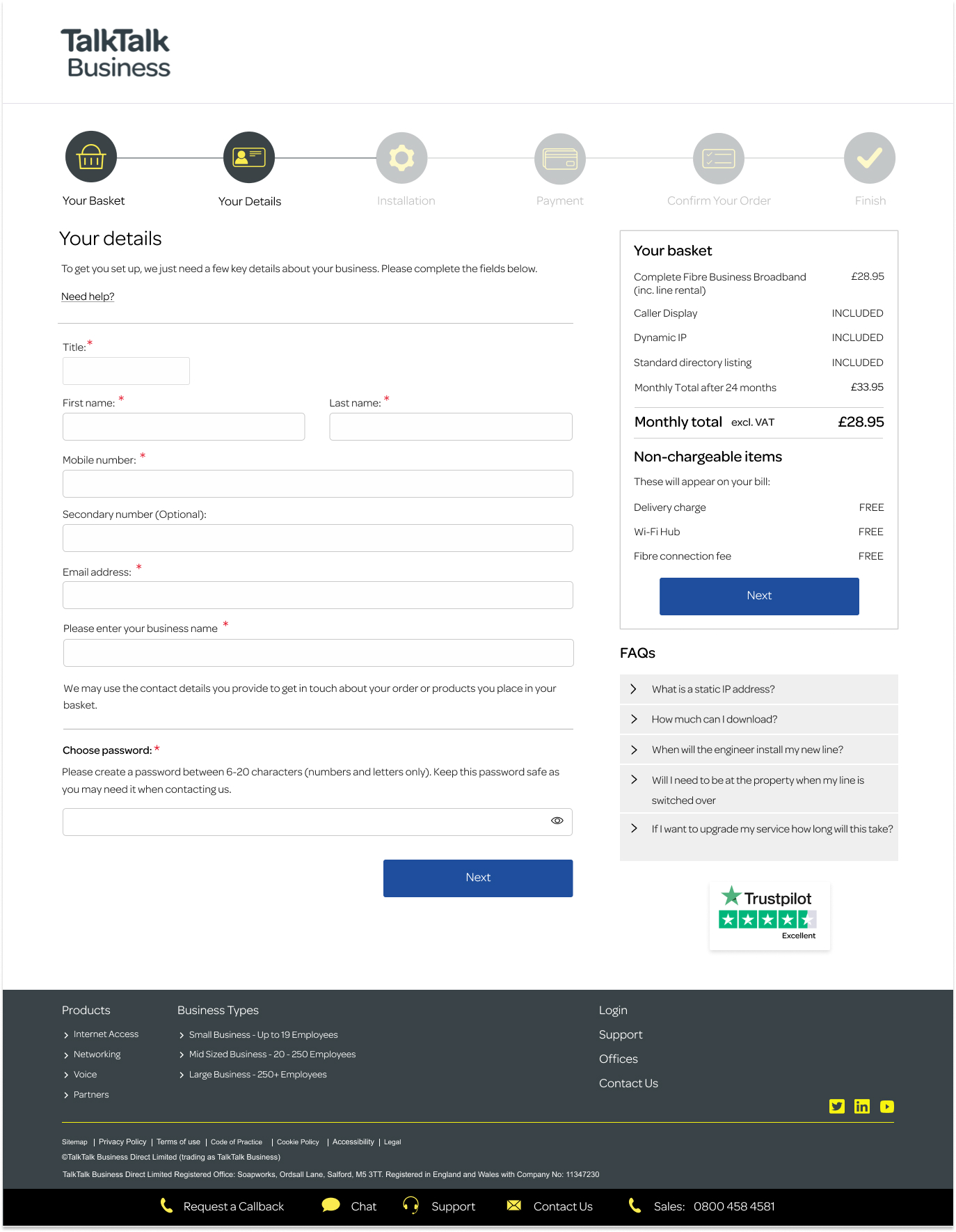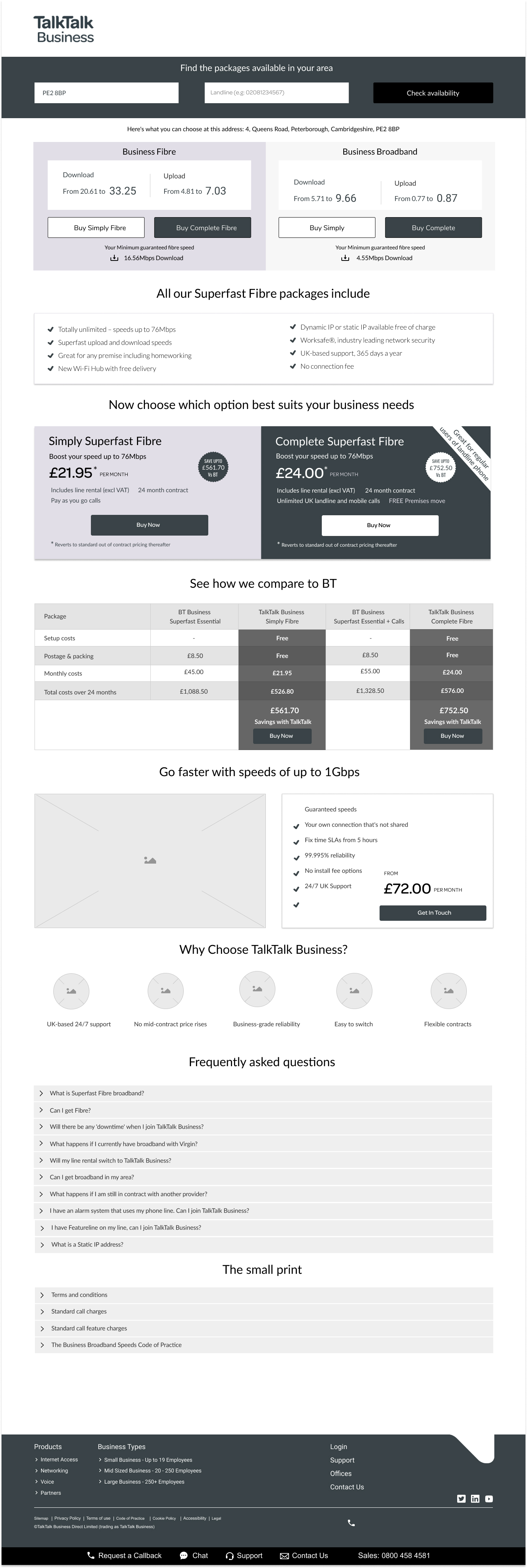 Four user tests were conducted with 32 participants recruited through User Testing. The goal of the testing was to identify usability issues on the FTTP checkout flow. The first couple of tests were thirty-minute, moderated sessions. Participants were given a scenario requiring them to buy a fibre broadband package on the TalkTalk website up until the payment page. The second two tests followed a similar structure but were unmoderated. In both cases, participants were given dummy data to use for form filling.