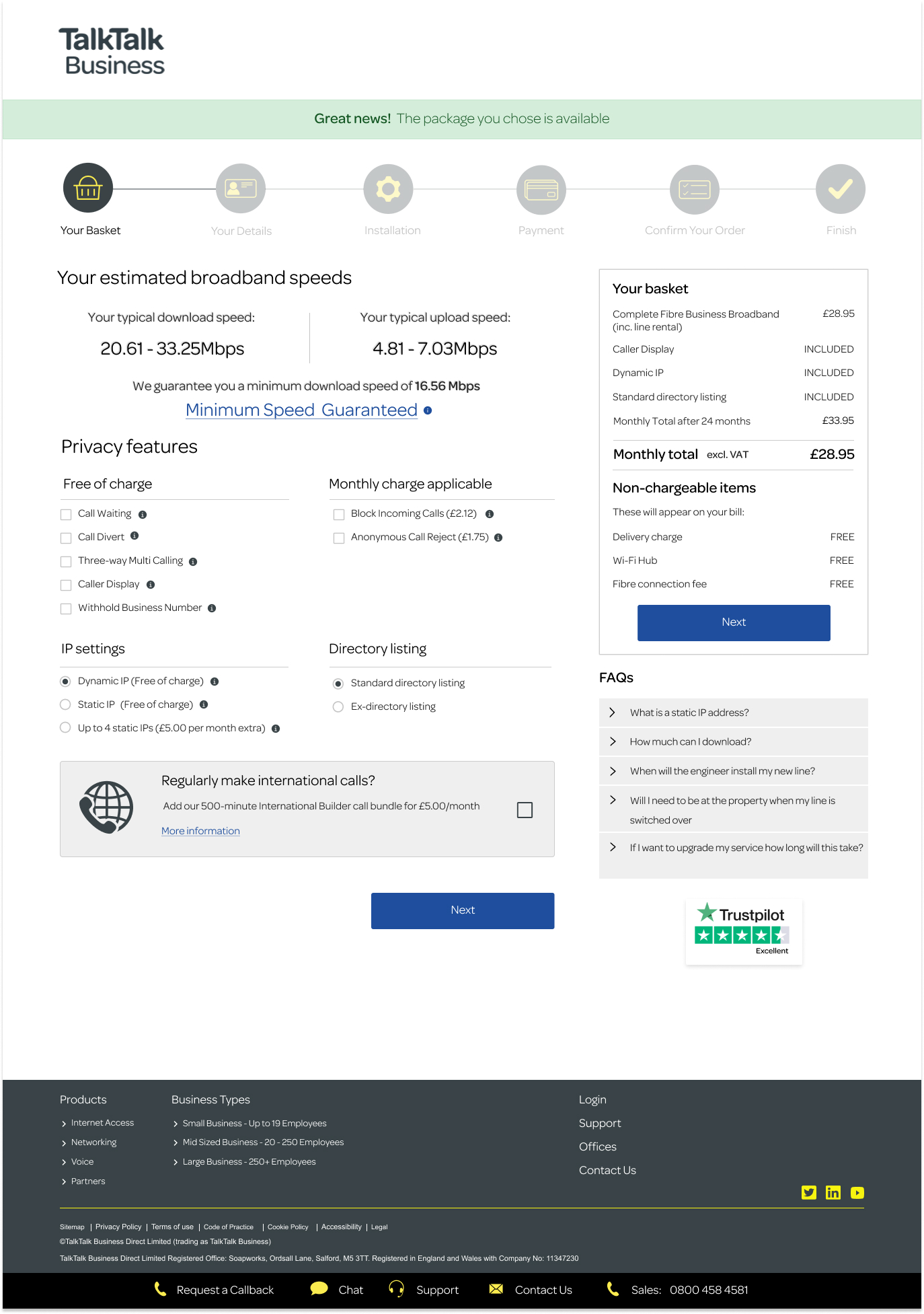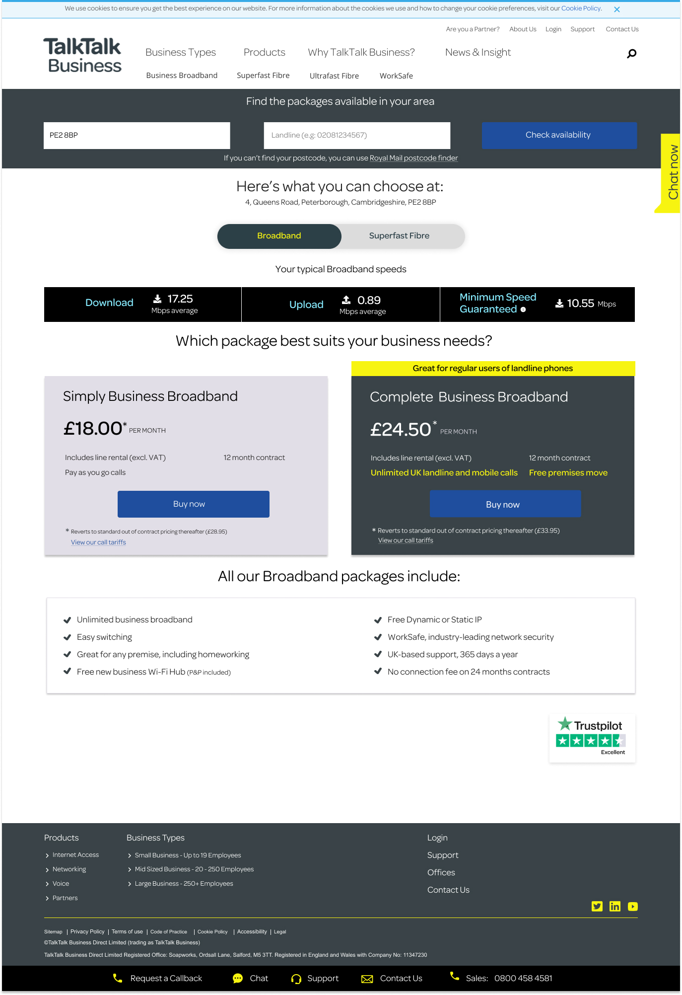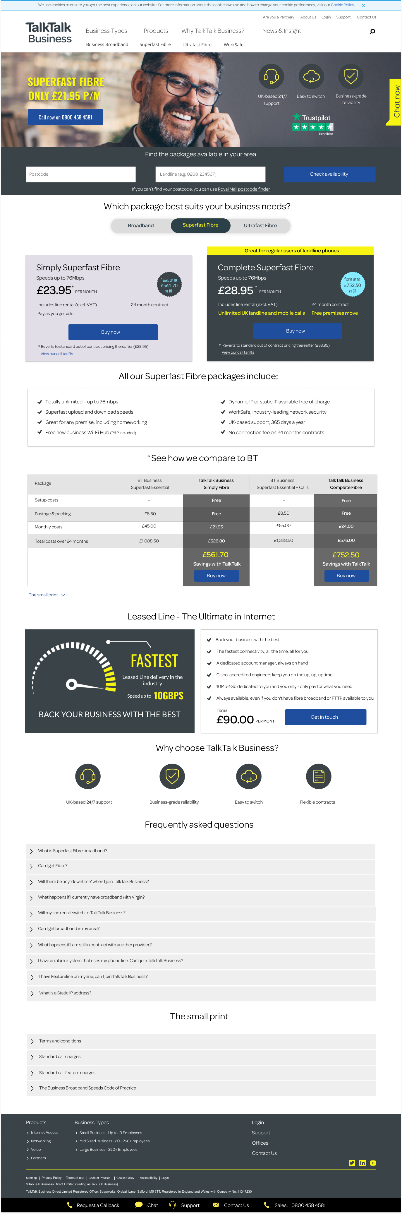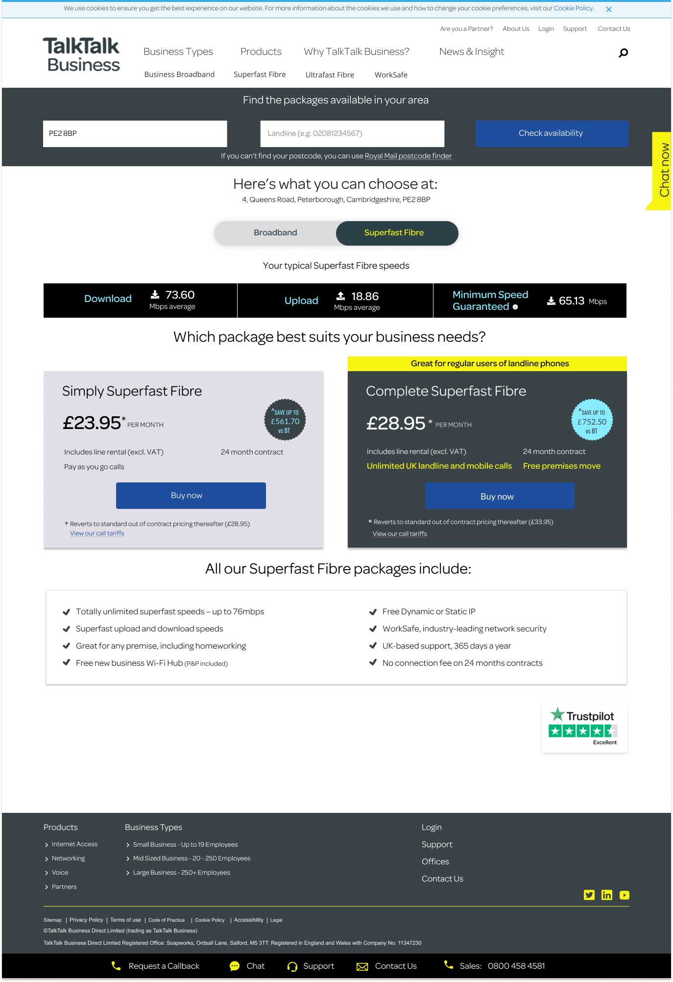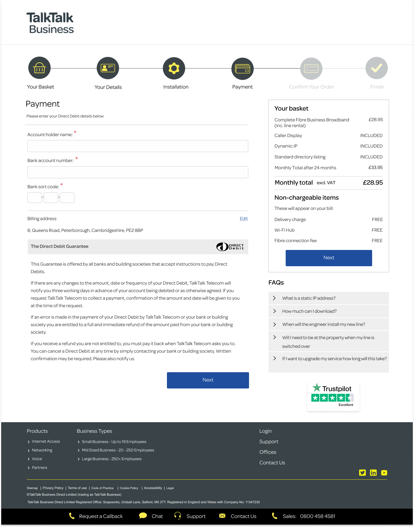 Four user tests were conducted with 32 participants recruited through User Testing. The goal of the testing was to identify usability issues on the FTTP checkout flow. The first couple of tests were thirty-minute, moderated sessions. Participants were given a scenario requiring them to buy a fibre broadband package on the TalkTalk website up until the payment page. The second two tests followed a similar structure but were unmoderated. In both cases, participants were given dummy data to use for form filling.