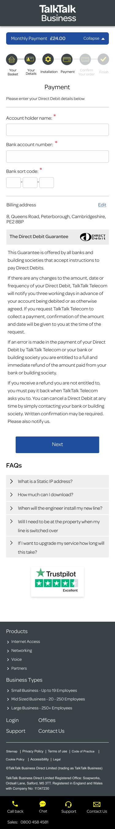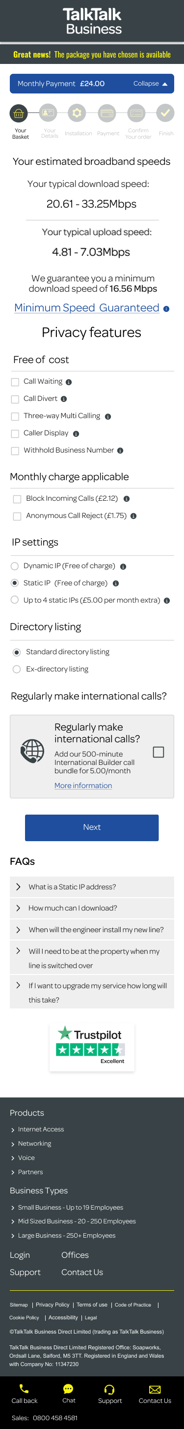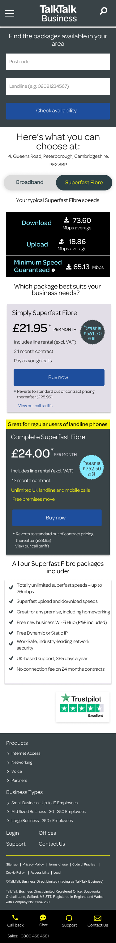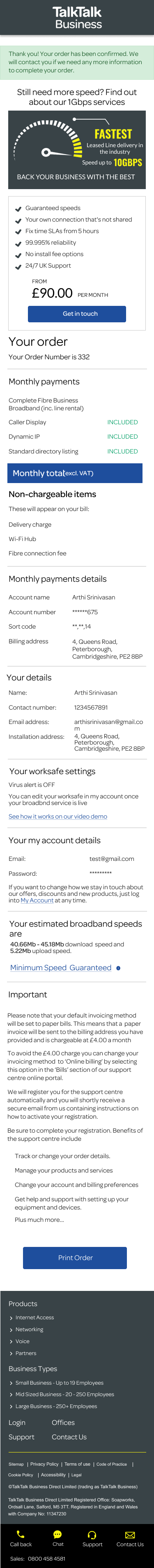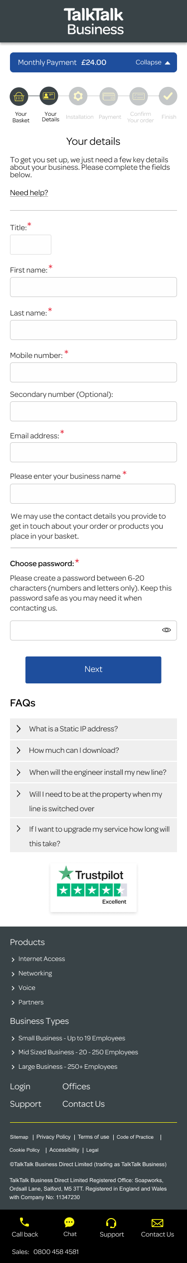 Four user tests were conducted with 32 participants recruited through User Testing. The goal of the testing was to identify usability issues on the FTTP checkout flow. The first couple of tests were thirty-minute, moderated sessions. Participants were given a scenario requiring them to buy a fibre broadband package on the TalkTalk website up until the payment page. The second two tests followed a similar structure but were unmoderated. In both cases, participants were given dummy data to use for form filling.